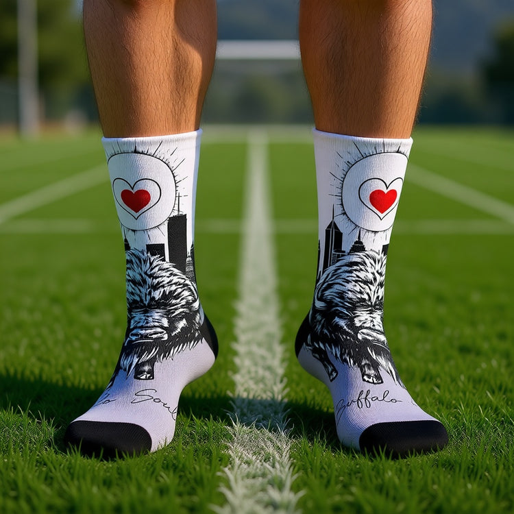 Step into Buffalo pride with these bold 716 Cityscape Recycled Socks. Crafted from eco-conscious recycled materials, these crew socks feature an artistic bison design adorned with hearts—a daring nod to the neighborhood spirit and boho vibes of Buffalo, NY. Perfect for locals and fans who wear their city love on their feet. Comfortable, sustainable, and unapologetically Buffalo Soul.